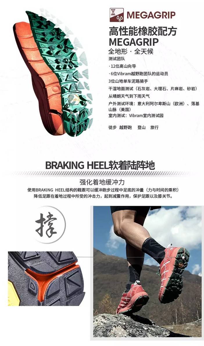 传统橡胶配方都无法兼备防滑性和耐磨性两个优点。Megagrip打破“配方越防滑就不耐磨”的“定律”,在显著提升防滑性情况下保留相同的耐磨性。这样的双重品质为户外产品用户提供多种好处。Vibram同时利用不同中底构造去优化对冲击能量的吸收(缓冲作用)和足底压力分布。