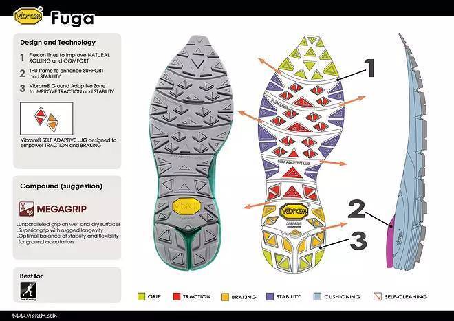 Vibram是世界上最著名的鞋底制造商,其制造的鞋底具有良好的防滑性和耐磨性,所以搭配Vibram鞋底的鞋子往往是各品牌的旗舰户外鞋和越野鞋。KAILAS fuga 2.0升级了全新Megagrip的防滑配方的Vibram大底,高弹性的减震中底,能够从容应对粗砺碎石和湿滑山路。
