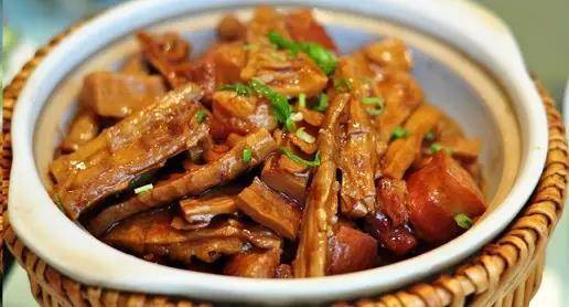 毛笋晒制的笋干+当地的土猪肉,红烧,笋沾肉香,肉油而不腻。