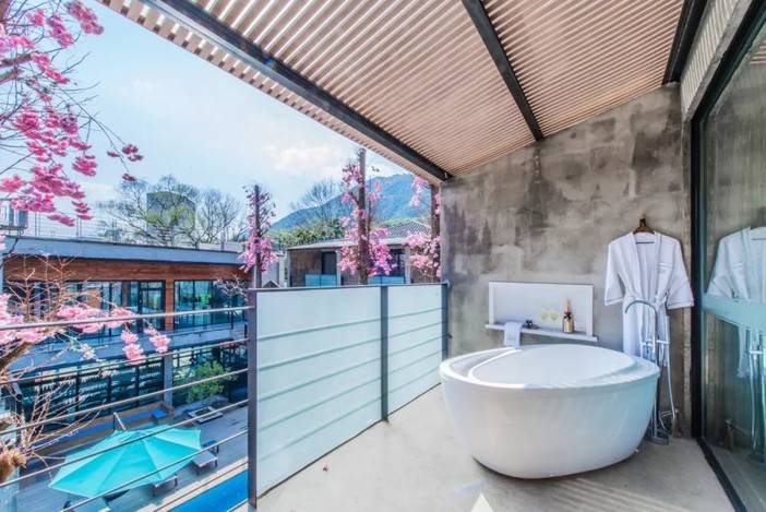 开放式浴室,让格局显得更为开阔和舒适,算得上诚意之作。最推荐LOFT房型,不仅面积大,还在阳台上还放置一个浴缸,在星空下泡澡,望出去就是看不到头的青翠竹海,情调满分。