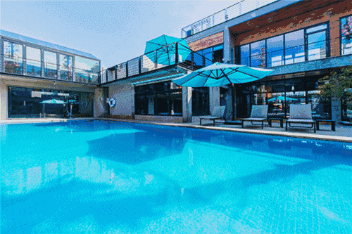 湛蓝见底的常温泳池,绿树成荫的公共空间