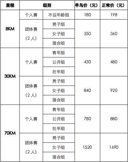 3. 8KM、30KM、70KM的团队赛有且仅能有2人参赛,分为男子组、女子组、混合组。
