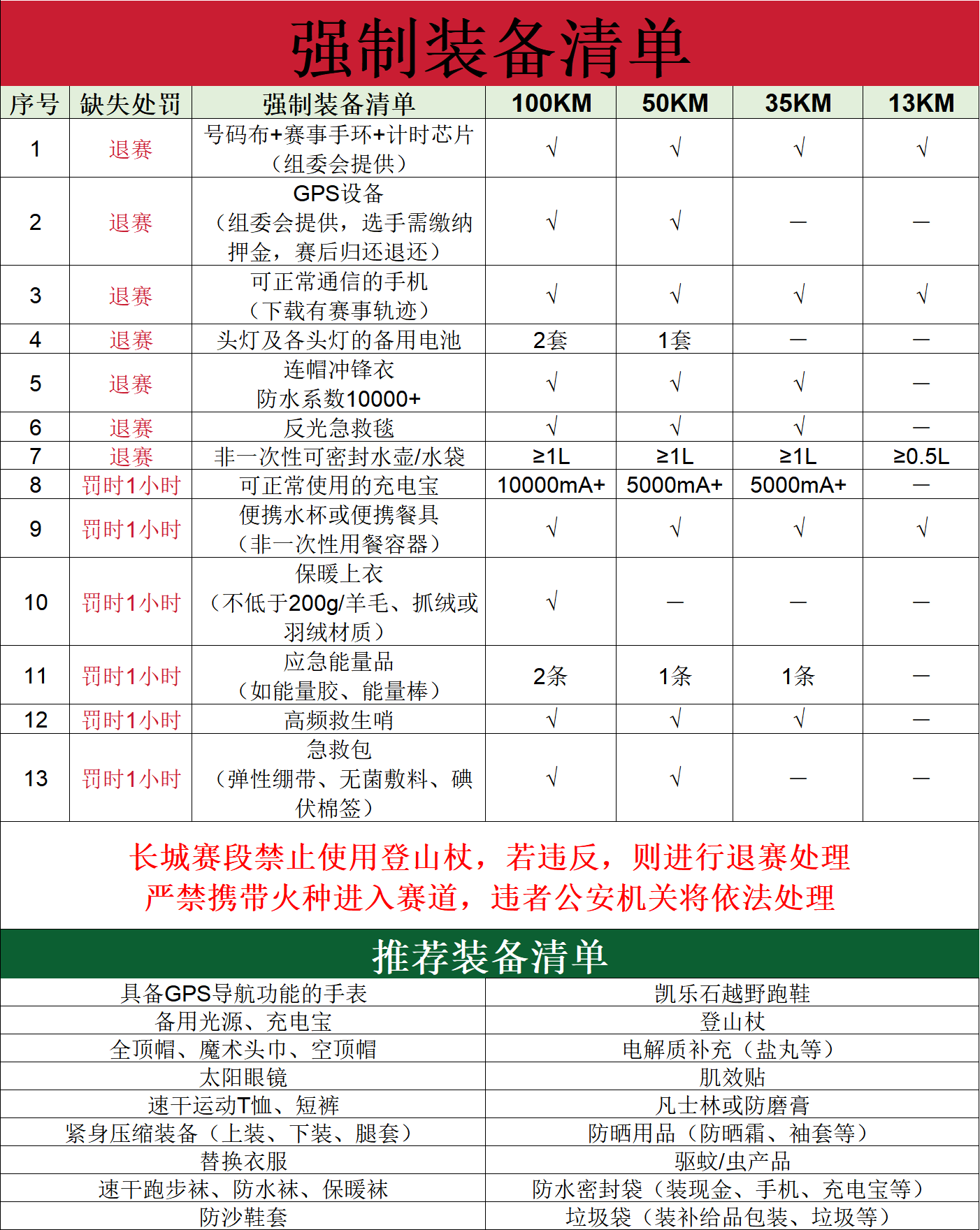 1.因本届赛事跨越时间比较长,早晚温差比较大,考虑安全的因素,组委会将在中途严格进行强制装备检查,若发现参赛者没有按规定备齐强制装备,将会进行罚时处罚或取消参赛者的成绩,并拒绝其继续参赛。